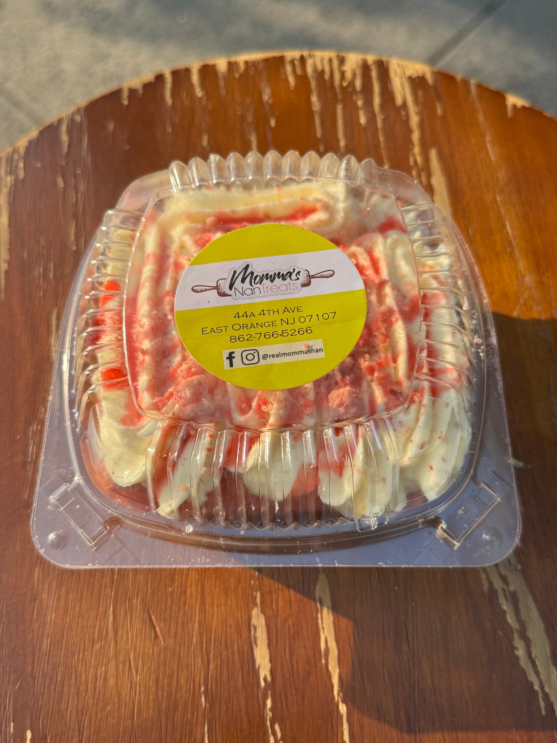Enjoy Momma Nan’s Strawberry Crunch Cake—moist strawberry cake layered with creamy frosting and a crunchy, buttery topping for the perfect sweet bite!